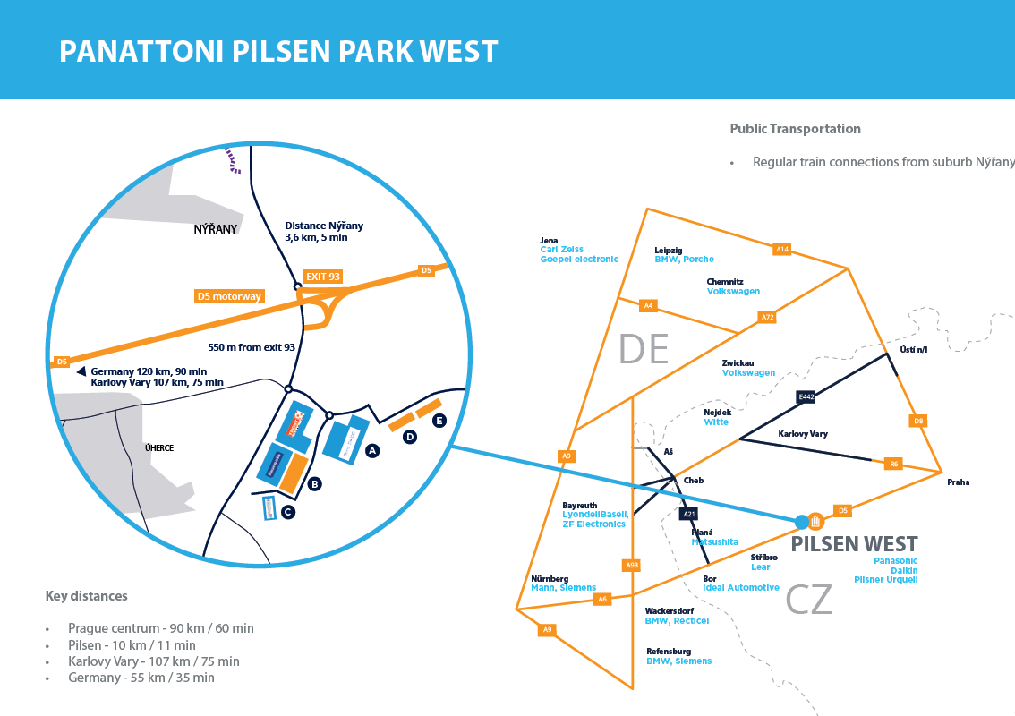 Istniejący już budynek i otaczające działki korzystają ze strategicznego położenia w sercu Czech, przy zjeździe nr 93 z autostrady D5. Autostrada D5 to bezpośrednia trasa prowadząca z Pragi (oraz ze wschodnich Czech za pośrednictwem praskiej obwodnicy) do Niemiec, stanowiąca część jednego z najważniejszych korytarzy autostradowych Europy. W bezpośrednim sąsiedztwie parku znajduje się strefa logistyczno-przemysłowo-handlowa, zaś miasto Pilzno leży w odległości niecałych 10 km od obiektu.